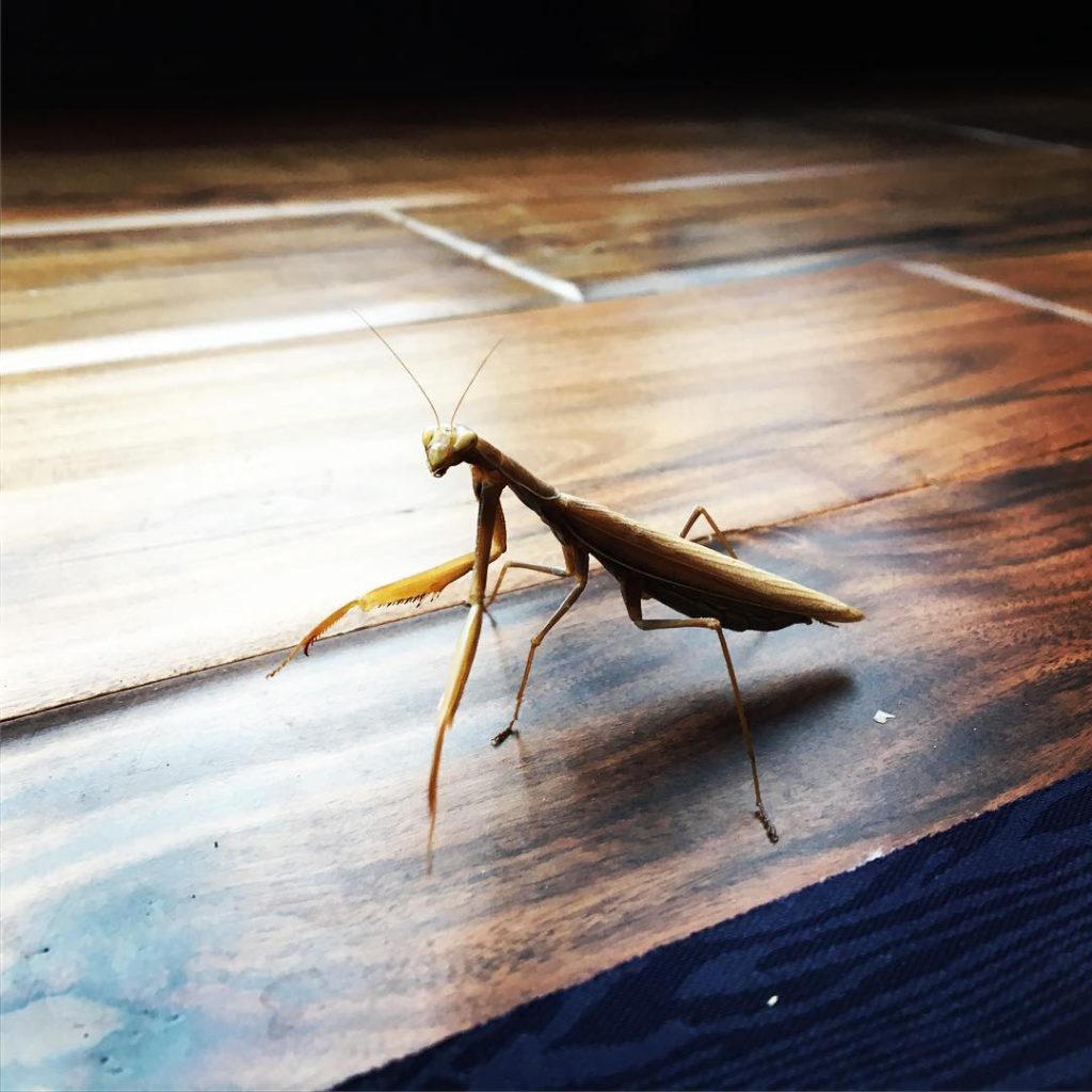 Well hello there. Crawled up on my leg while getting headspace. #mantis #prayingmantis #creepedmeout